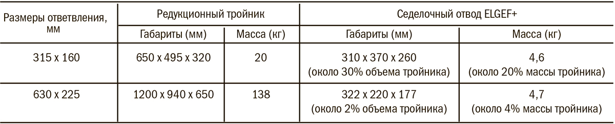 Принимая во внимание аспекты перевозки и хранения литых тройников с редукционным переходом и седелочных отводов, с помощью которых можно собрать подобный переход, несложно сделать вывод об очевидной выгоде применения отводов. Подтверждение этому можно увидеть в таблице ниже.