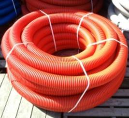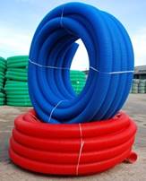 - Двухслойные гофрированные трубы для защиты кабелей выпускаются двух цветов: красные - для электрических кабелей, синие - для систем связи и телекоммуникаций.